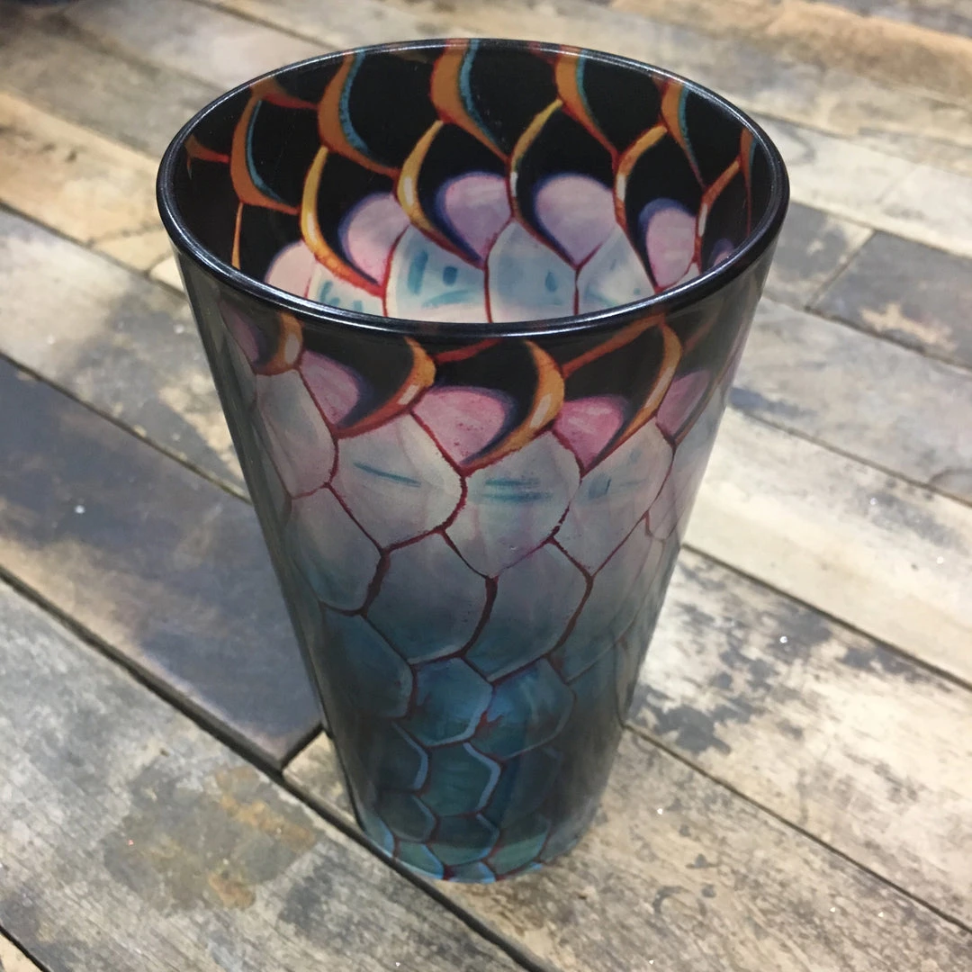 DeYoung Pilsner Glass with fly fishing theme. These heavy duty, 16 oz. Pilsner glasses showcase the best of DeYoung’s Abstract Fish Flank Series in a beautiful fully wrapped print within the glass. Microwave safe, but not dishwasher recommended.