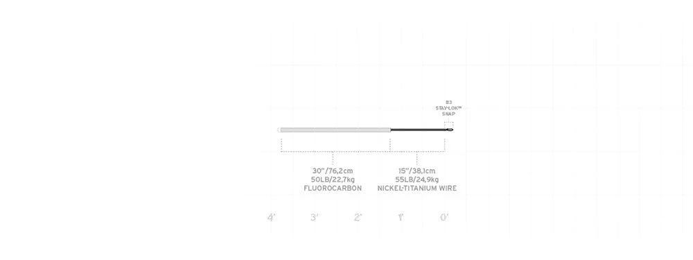 | 30″ / 76,2cm | 50lb / 22,7kg fluoro | 15″ / 38,1cm | 40lb / 18,1kg 7×7 Stainless Steel | Size 3 Stay-Lok Snap |