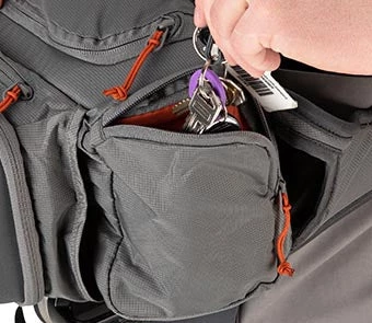 - Zippered secure stash pocket with key clip for phone/key storage; secondary stash pocket at top of pack holds lunch or extra layer.